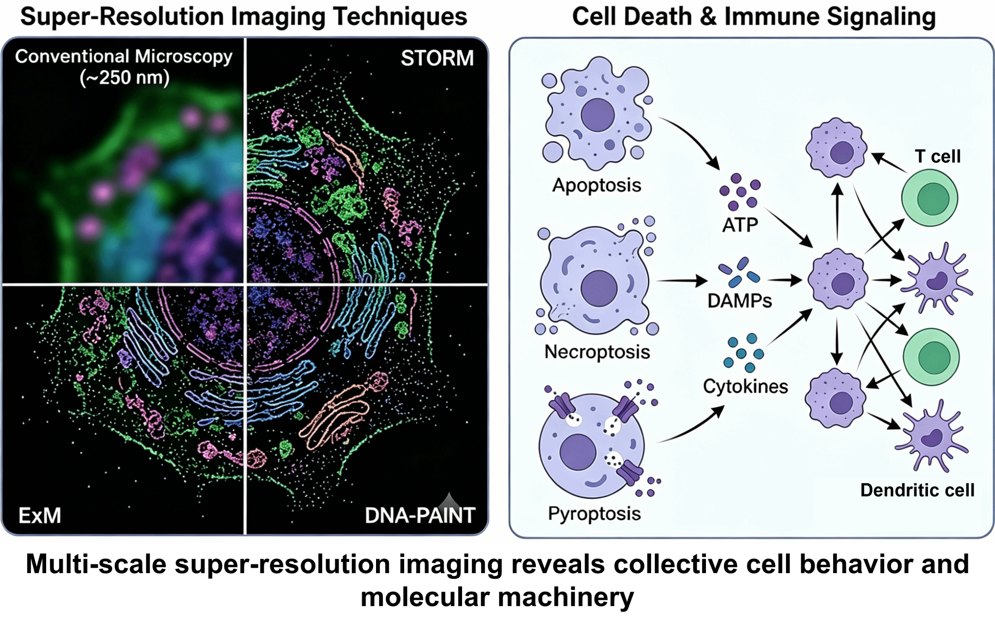 细胞死亡与免疫是维持机体稳态及抵御外界侵袭的核心生物学过程。不同类型的程序性细胞死亡(如凋亡、坏死性凋亡和焦亡等)不仅决定细胞命运,还通过释放特定信号分子参与免疫调控,塑造炎症反应与抗病毒防御网络。技术手段的革新往往能够有效地促进科学的发展,超分辨光学显微成像技术突破了衍射极限(~250 nm),为生命科学研究注入了新的活力,催生新的激动人心的发现。其中,STORM、DNA-PAINT 以及ExM 等方法可以实现了对大分子复合物及其组装结构的高精度定位与定量分析,以及细胞群体复杂事件系统解析。本课题组聚焦细胞死亡与免疫信号交叉领域,发展科学问题驱动的超分辨成像标记成像分析策略,揭示炎性细胞死亡分子机制及其在生理病理中的作用,为相关疾病高效干预手段开发提供前期的理论基础。